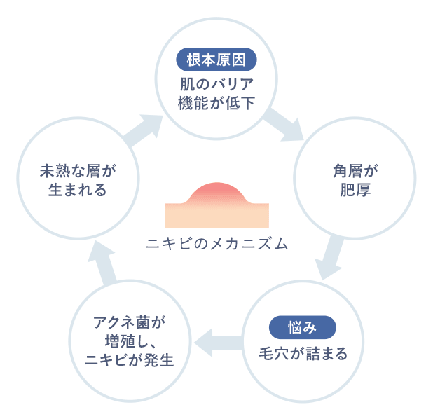 そこに、さらっと肌をカバーしてニキビを沈静化、思春期ニキビの悪循環を断ち切るのがニキビケア*1)化粧水や保湿液・乳液の役割なんです。