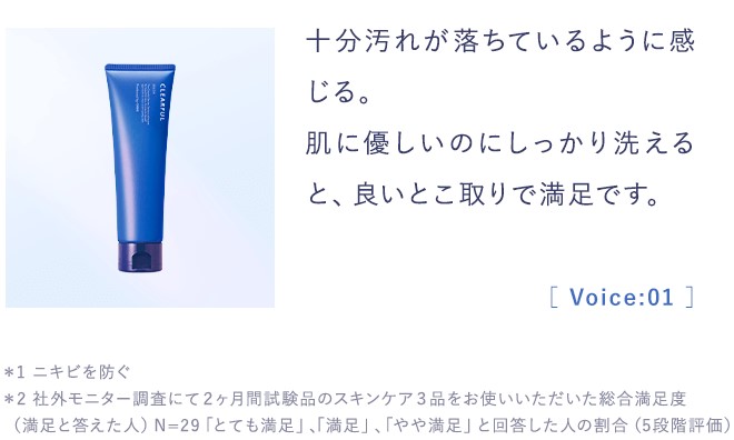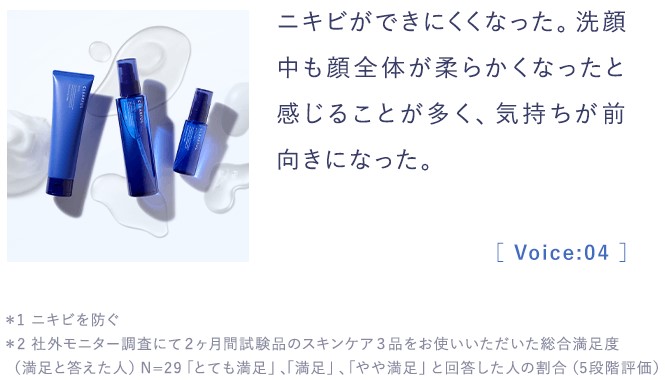 利用者の声①ニキビができにくくなった。洗顔中も顔全体が柔らかくなったと感じることが多く、気持ちが前向きになった。
